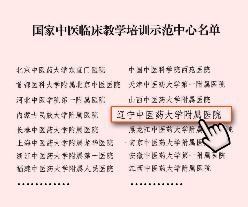 近日,教育部办公厅、国家中医药管理局综合司发布“国家中医临床教学培训示范中心认定结果”,全国共有33家高校(单位)附属医院(牵头医院)被认定为国家中医临床教学培训示范中心,辽宁中医药大学附属医院荣耀上榜。